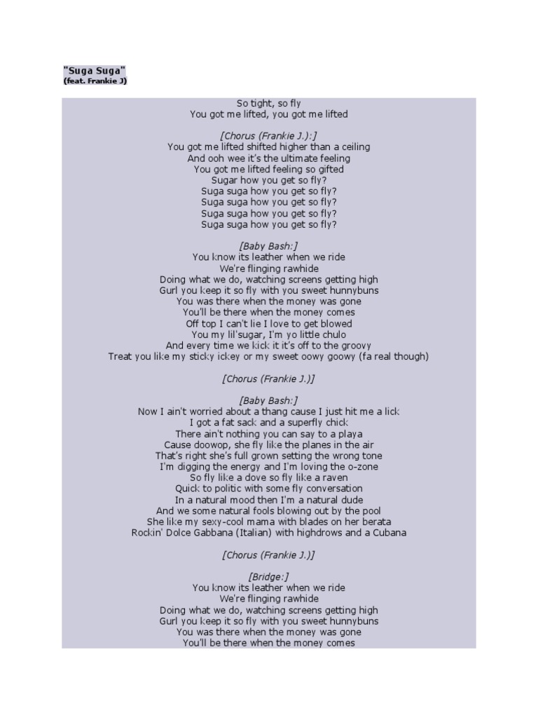 Aug 05, 2003 · sugar, sugar, how you get so fly sugar how get so fly. So tight, so fly / you got me lifted, you got me lifted / you got me lifted shifted higher than a ceiling / and ooh wee it's the ultimate feeling / you got me lifted feeling so
